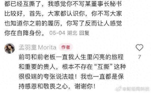 5月12日,据财经网科技,近日,有网友在孟羽童的社交账号底下留言称:“都已经互撕了,我感觉你不写某董事长秘书比较好,首先,大家都认识你,你不写大家也知道你之前的履历,你写了反而让人感觉你在自降身份。”